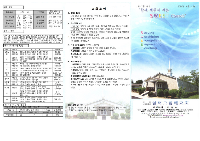 April 16, 2024 . 샴버그침례교회 2024년 4월 14일 교회 주보