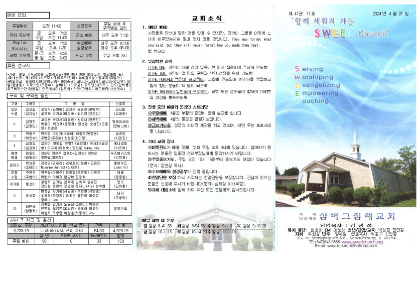 April 21, 2024 . 샴버그침례교회 2024년 4월 21일 교회 주보