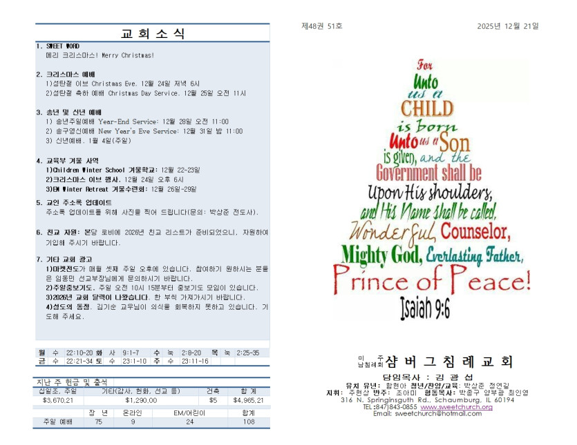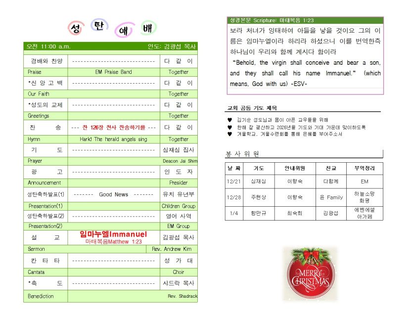December 21, 2025 . 샴버그침례교회 2025년 12월 21일 성탄주일 교회 주보