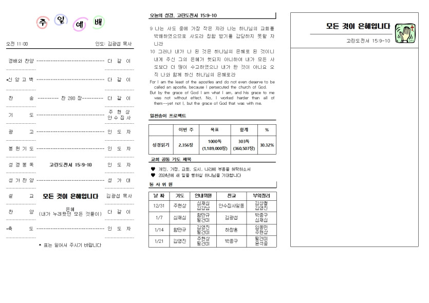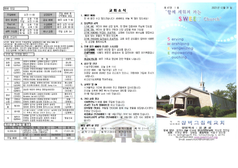 January 03, 2024 . 샴버그침례교회 2023년 12월 31일 교회 주보