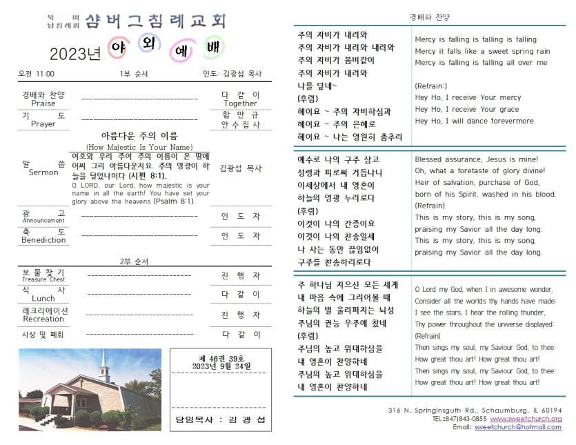 September 26, 2023 . 샴버그침례교회 2023년 9월 24일 야외 예배 주보