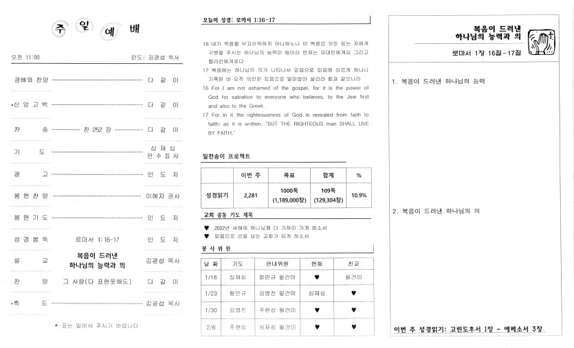 January 27, 2022 . 샴버그침례교회 2022년 1월 16일 주보
