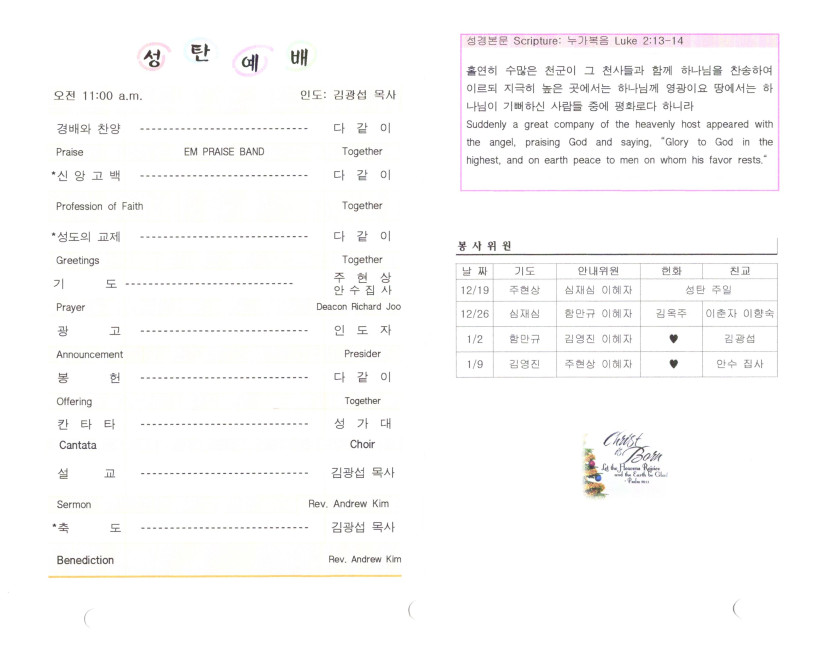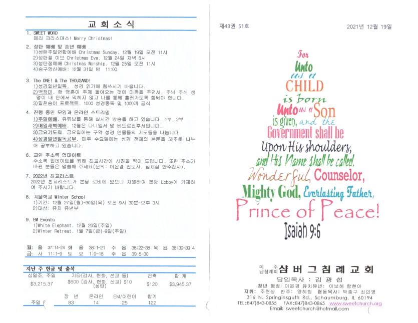 January 04, 2022 . 샴버그침례교회 2021년 12월 19일 주보