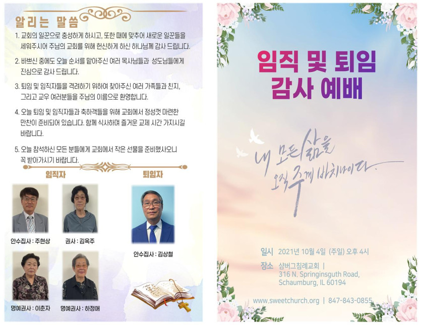 October 13, 2021 . 샴버그침례교회 2021년 10월 3일 퇴임 및 임직 예배 주보