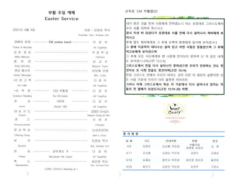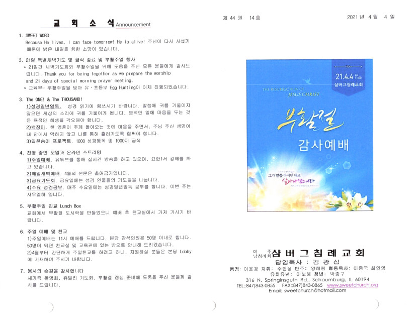 April 16, 2021 . 샴버그침례교회 2021년 4월 4일 주보