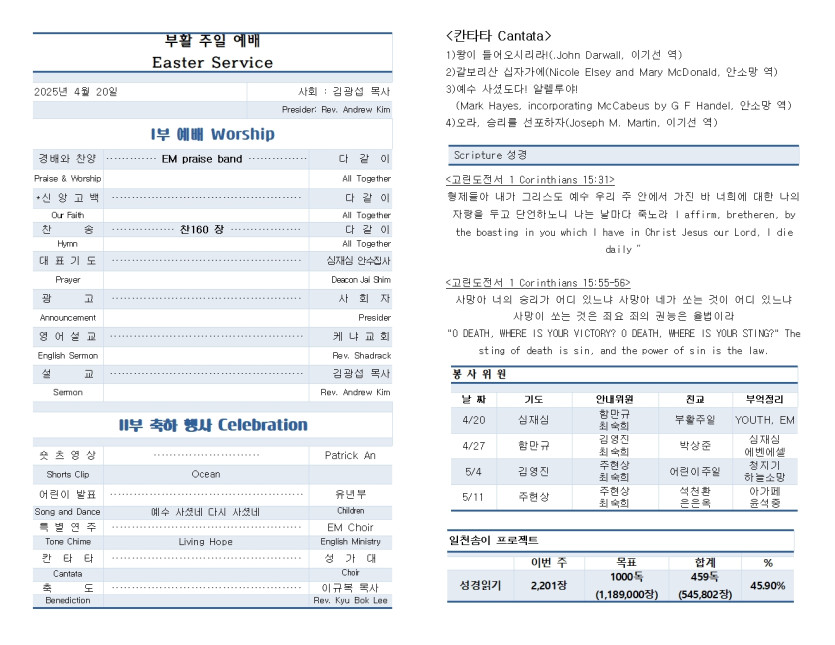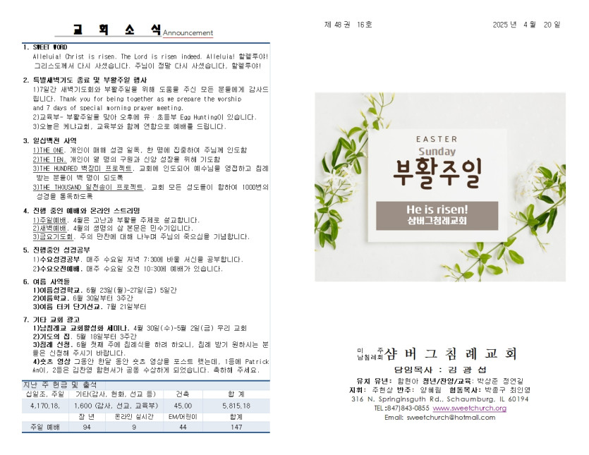 April 20, 2025 . 샴버그침례교회 2025년 4월 20일 교회 주보