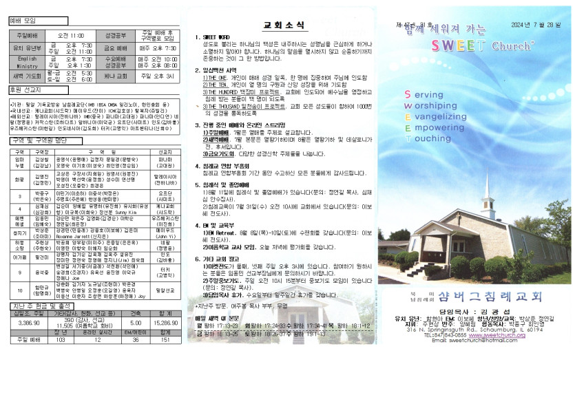 July 28, 2024 . 샴버그침례교회 2024년 7월 28일 교회 주보