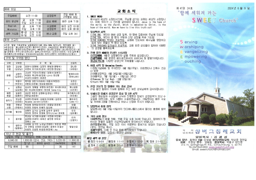 June 09, 2024 . 샴버그침례교회 2024년 6월 9일 교회 주보